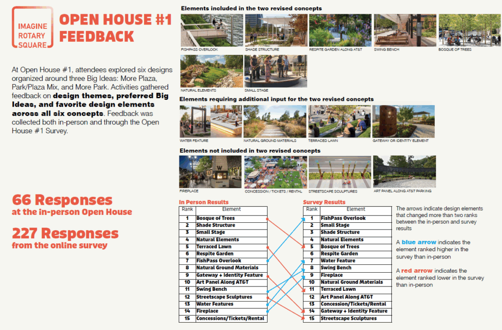 Using that public input, the preliminary design concepts were unveiled for further public feedback at an open house in May, followed by a public survey. A second open house was held in July, followed by another public survey. A final concept, refined with public feedback to the preliminary designs, was approved by the DDA Board of Directors in October.